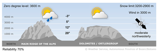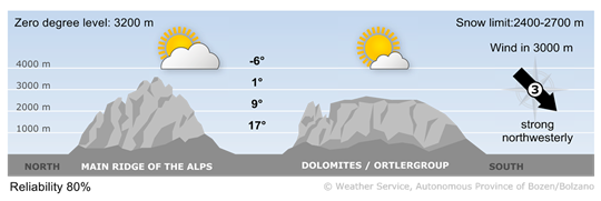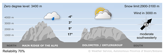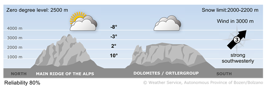After the breakup of the low clouds, the weather will become partly sunny. However, veil clouds will dim the sunlight and create diffuse lighting conditions over South Tyrol’s mountains.