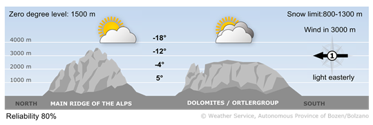 At the start of the week on Monday, it will be quite pleasant with a mix of sun and cumulus clouds. On Tuesday, it will be mainly sunny with a few harmless clouds. Wednesday will start sunny. Cloud will increase during the day, and in the evening and overnight into Thursday a marked cold front will bring widespread precipitation. The snow line will fall below 1000 m. On Thursday, it will be windy and cool, with some snowfall along the main Alpine ridge and in the eastern parts of the region.