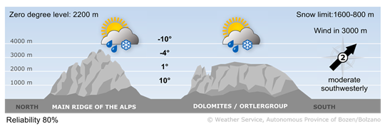 Cloudy weather with cold and very strong north wind. Snow will fall initially in the northern and eastern parts of the region, but as the day progresses, the snow showers will retreat to the main Alpine ridge. The snow line will be between 700 and 1000 m. Temperatures will reach highs of 2° in teh north and 12° in the south.