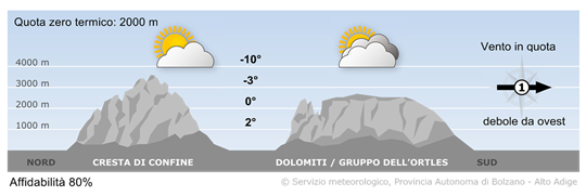 Le nubi basse presenti soprattutto nelle vallate a sud tenderanno a dissolversi in mattinata. Altrove il tempo sarà abbastanza soleggiato con delle nubi alte in transito. Temperature massime tra 2° in Alta Val d'Isarco e 7° a sud.