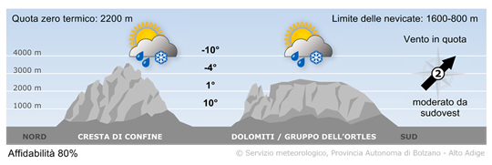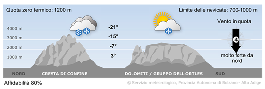In montagna il vento sarà a tratti molto forte e freddo da nord. Inizialmente ci saranno nevicate su molti gruppi montuosi, in giornata le precipitazioni riguarderanno solo la cresta di confine. Apporti più consistenti di neve fresca sono attesi tra il Brennero ed il Passo Stalle.